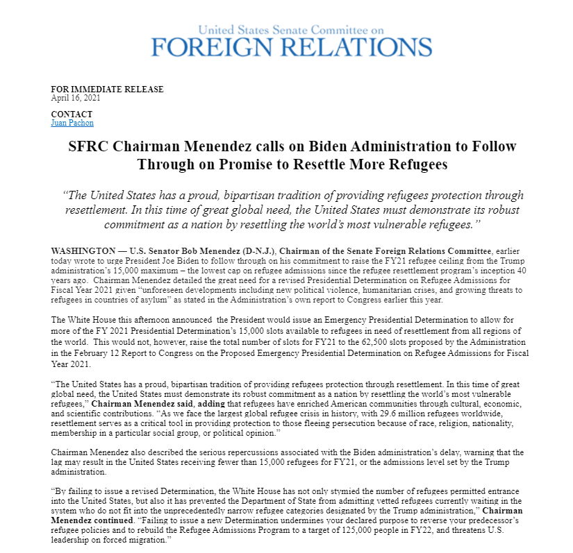 És profundament decebedor que el president Biden hagi decidit mantenir per ara el límit rècord d'admissió de refugiats de 15.000, establert pel seu predecessor. En un moment de necessitat mundial sense precedents, els Estats Units encara estan lluny de tornar al seu paper històric de ser un refugi segur per als perseguits i els més vulnerables del món.