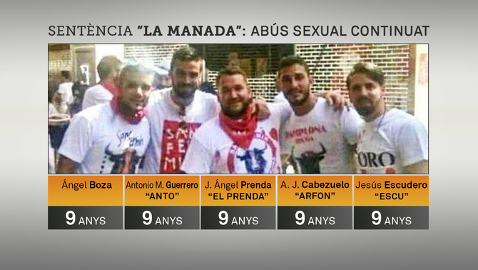 Pels magistrats de l'Audiència de Navarra, no hi va haver violació en grup a una noia de 18 anys als Sanfermines del 2016, sinó abús sexual continuat. Per això, el tribunal ha condemnat a 9 anys de presó José Ángel Prenda, Ángel Boza, Antonio Manuel Guerrero Escudero, Alfonso Jesús Cabezuelo i Jesús Escudero, i els ha absolt dels delictes d'agressió sexual, contra la intimitat i de robatori amb intimidació dels quals havien estat acusats.
